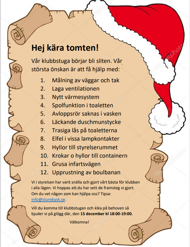 Vår klubbstuga börjar bli sliten. På årets önskelista till tomten ber vi om hjälp med: 1. Målning av väggar och tak 2. Laga ventilationen 3. Nytt värmesystem 4. Spolfunktion i toaletten 5. Avloppsrör saknas i vasken 6. Läckande duschmunstycke 7. Trasiga lås på toaletterna 8. Elfel i vissa lampkontakter 9. Hyllor till styrelserummet 10. Krokar o hyllor till containern 11. Grusa infartsvägen 12. Upprustning av boulbanan Om du vet någon som kan hjälpa oss? Tipsa: info@sturebysk.se. Vill du komma till klubbstugan och kika på behoven så bjuder vi på glögg där, den 15 december kl 18:00-19:00. Välkomna! Hälsar styrelsen Stureby SK 3 dec 2022 0kommentarer